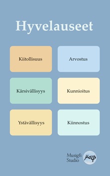 ja muiden positiivisen toiminnan ja hyvien ominaisuuksien huomaamiseen sekä vinkkejä hyveisiin liittyvään taiteelliseen työskentelyyn.